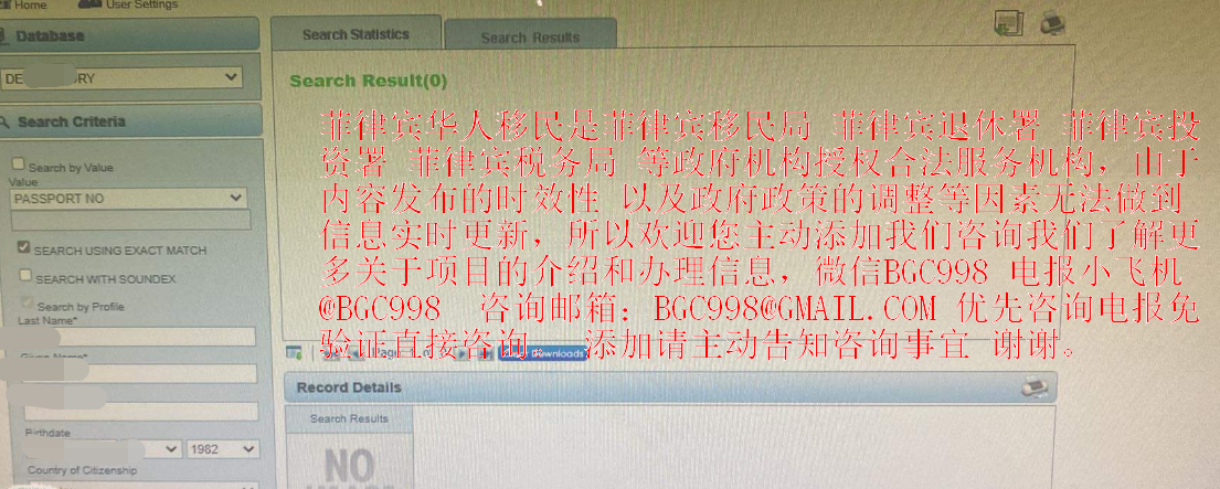 查询结果会直接拍照移民局档案发送给您 由于信息属于机密 所以您自己去查询是查不到的也不能给您查的,所以都需要有权限的政府官员去查询,欢迎咨询我们了解更多,微信BGC998 电报小飞机 @BGC998 WHAT'S APP+639120912222 优先咨询电报免验证直接咨询,添加请主动告知咨询事宜 谢谢。